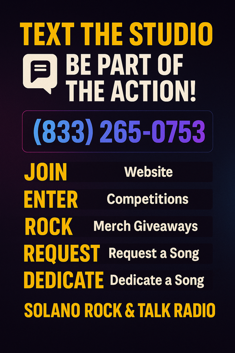 🎸📱 Text the Studio — Be Part of the Action! 🤘Hey Rockers & Talkers! We’ve made it even easier for YOU to get involved with Solano Rock & Talk Radio! Whether you want to join the website, enter a competition, or shout out your favorite tune — all you need is one number: 📞 Text us at (833) 265-0753 Use these special keywords to send your message: 📲 Text Word 🎯 What It Does Join Opt-in and join our website community for news, updates & VIP perks Enter Enter our latest on-air competitions and win cool prizes Rock Join our Merch Giveaways for exclusive Solano gear Request Request your favorite song to play live on air Dedicate Send a dedication or shoutout to someone special 💬 Each keyword gets you directly where you want to go — no forms, no hassle. Just text and rock on! 👉 Pro Tip: Once you’ve texted Join, you’ll get updates and alerts for every contest, event, and giveaway we run. 🖤 Stay loud, stay connected, and keep rocking with Solano Rock & Talk Radio!